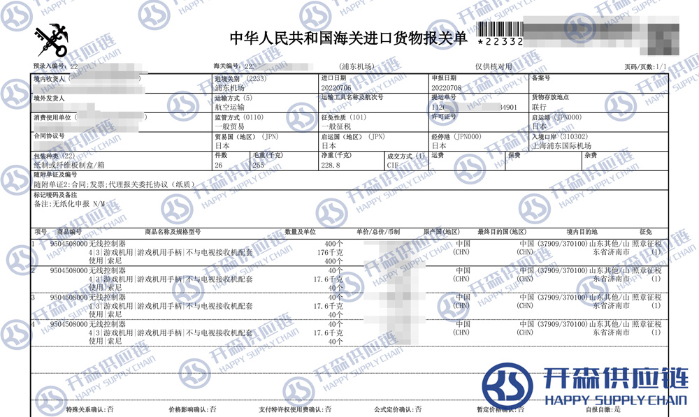 【本文結(jié)語】 上述就是日本游戲手柄進(jìn)口清關(guān)報(bào)關(guān)代理服務(wù)【經(jīng)典案例】的全部內(nèi)容,希望能對您有所幫助,如有游戲機(jī)進(jìn)口報(bào)關(guān)上任何疑問及問題可隨時(shí)在線聯(lián)系我們或撥打 18002611553,開森供應(yīng)鏈擁有豐富的游戲機(jī)進(jìn)口報(bào)關(guān)操作經(jīng)驗(yàn)及案例,10余年進(jìn)口經(jīng)驗(yàn)為您所用,各類進(jìn)口疑難都能為您一一解答及協(xié)助快速處理解決!