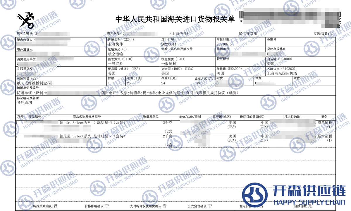 開森進口供應鏈擁有球星卡進口報關操作經(jīng)驗及案例,十余年操作經(jīng)驗及案例可供參考,可按需定制球星卡進口方案,幫助客戶解決進口難題,快速進口清關到港到貨。